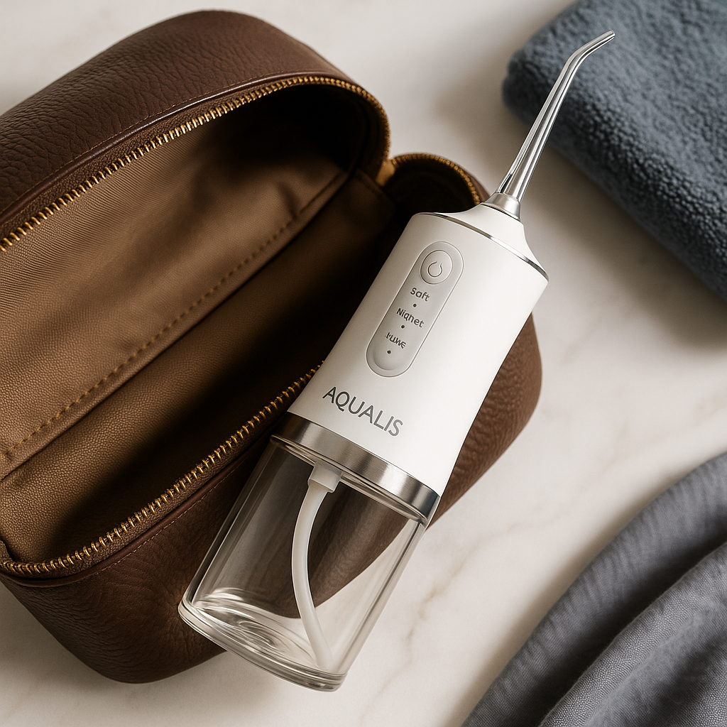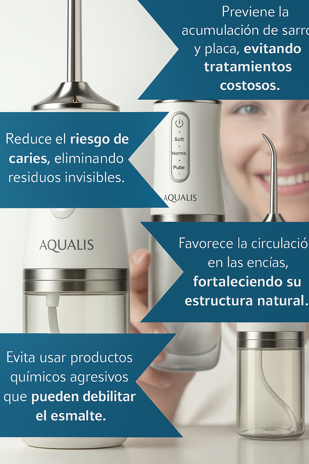 AQUALIS limpia profundamente entre dientes y encías con pulsos de agua que eliminan bacterias y residuos sin dolor, sin esfuerzo y sin irritar.