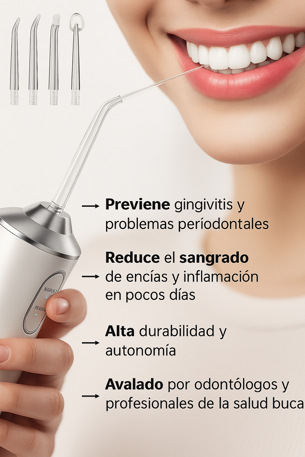 AQUALIS tiene presión regulable y boquillas suaves que masajean tus encías, no las lastiman.